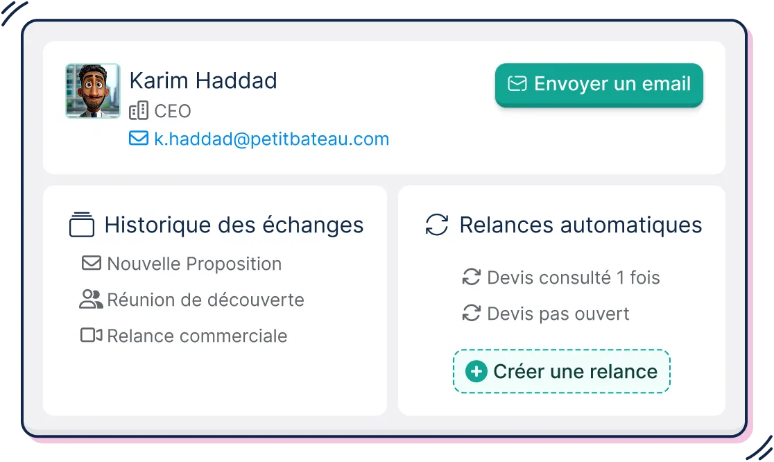 Envoi d’email ou de SMS directement depuis la fiche contact.